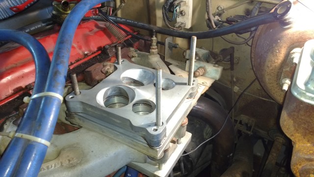 I got rid of the large heat shield because it make it much more difficult to install the spreadbore adapter bolts. I had my doubts that it was providing much benefit and I used a gasket-shaped heat dissipator plate instead. I exchanged a pair of short studs for long studs at this time. Depending upon whether the carb runs hot and available hood clearance, I may have to use longer studs later.