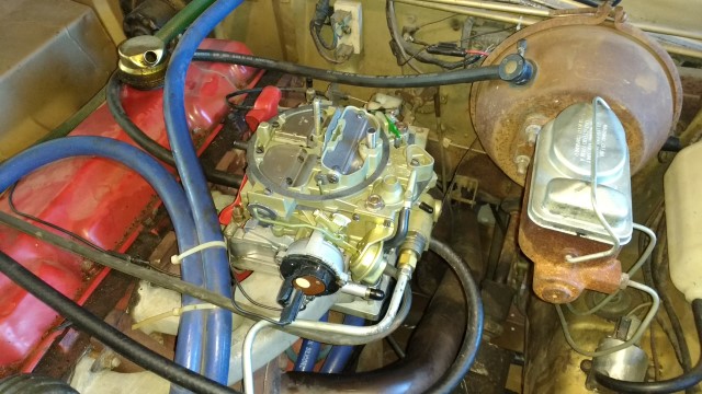 The Quadrajet looks pretty good back on the slant six. It took some work to get the car running because the idle mixture screws were turned in and the car would stall as soon as choke started to open. I also had to bend the throttle bracket forward because I couldn't reduce the idle speed otherwise.