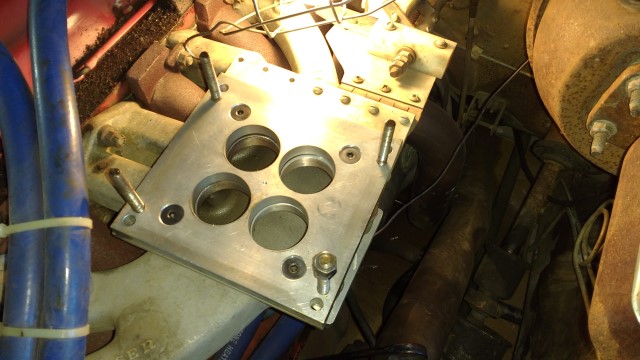 After taking the AFB off, I was once again looking at my 90° carb adapter. The studs that hold down the carb are locked with nuts under the adapter. I had to remove the nuts so I could install bolts in the outer holes to hold down the adapter.