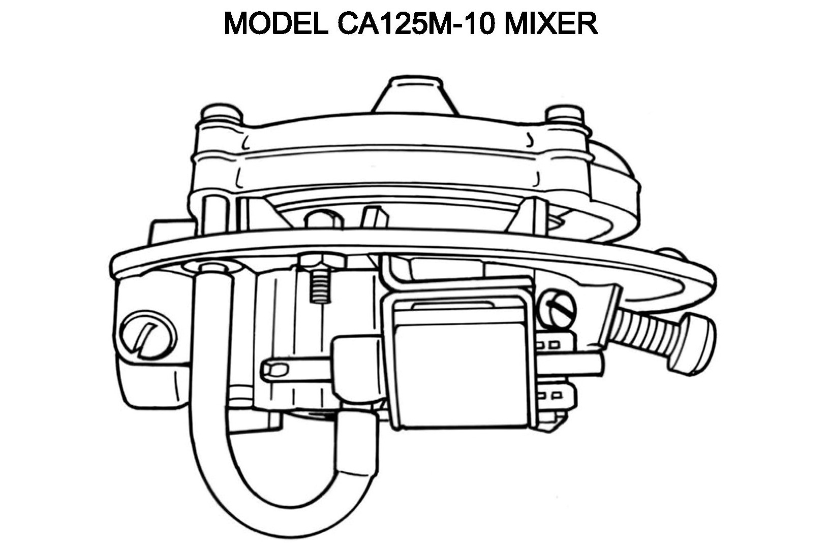 The CA125M-10 similar to the CA125M mono-fuel mixer except that it has been modified with a vacuum lift for the gas valve. A CA125M-10 mixer can be fitted to the air horn of a carburetor with the now obsolete AA3-4 adapter, which mated to CA300A adapters. However, a machinist could easily build an adapter like the AA3-4. The CA125M-10 mixer can also be fitted to a gasoline carburetor's air horn with the low-profile Unidapt system using the A1-53 adapter.