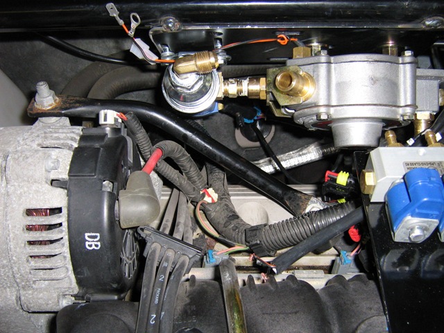 The really technically challenging part of an injection conversion is splicing the propane system's wiring into the engine's wiring harness. On universal systems, the installer has to figure out which wires to splice into. On model-specific systems, the kit manufacturer's wiring diagram specifies exactly which wires go where. On the Impala, the vehicle's computer is located in the airbox and splices were made near the PCM connectors. |