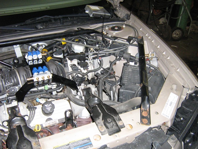 The first step of the conversion is determining where the hardware will be located. In a model-specific conversion, all the brackets and detailed instructions are included in the kit. The ECU also comes pre-programmed so that it runs properly out of the box. As this was a prototype, we spent a great deal of time to figure out the best location for the various components. (Where's the converter in this photo?) There were some hardware layout changes compared to the 2004 Impala. Notice the Y-shaped injector bracket. Although simple in appearance, there was some significant engineering time involved to ensure proper fit. |