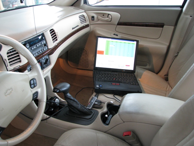 The final part of the conversion is setting up the fuel map. The SVIS has a fuel map table that relates propane injector pulse width to gasoline injector pulse width and RPM. This must be done for each universal SVIS conversion but the model-specific SVIS kits include this programming. Ideally, model-specific kits should run properly out of the box but fine-tuning is sometimes useful for a perfect operation. When setting the fuel map, the sum of the short and long term fuel trims should be as close to zero as possible at all times. This requires the use of an OBDII scanner during the fuel mapping process. We've got an ElmScan 5 USB connected to the laptop to read the OBDII codes. |