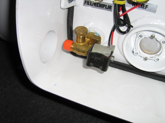 The bumper on Impala has a very conveniently located hole in the bumper's reinforcement, which is perfect for installing the flush-mount Airod filler valve. The Airod is a bit more expensive than the Sherwood fill valves but is much more attractive. A 2-5/8" diameter hole is required to mount this filler valve in the bumper. In Canada, all hoses must be purchased as hose assemblies. The silver tag indicates the certification. |